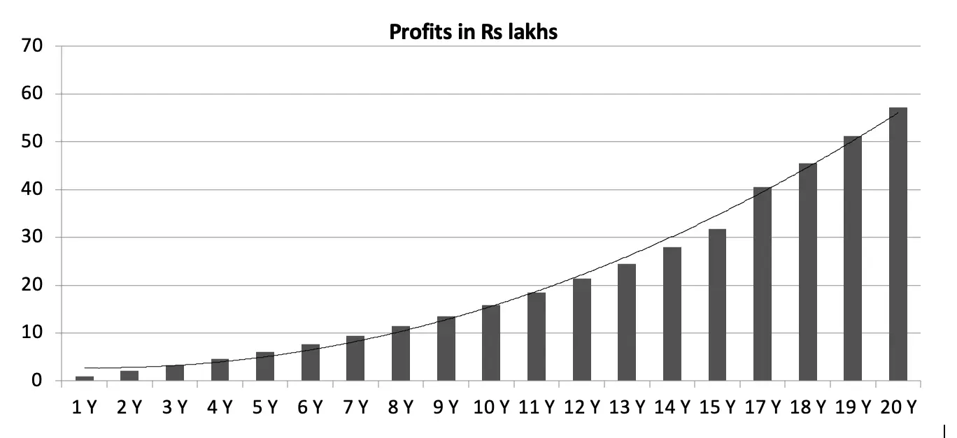 Tenure is the most important factor in the formula of compound interest. Let us assume you invested Rs 10 lakhs and the return is 10% p.a. You can see that profit is not growing linearly. In 3 years profit is around Rs 3 lakhs, but in 20 years profit is around Rs 57 lakhs. This is power of compounding (interest on interest).