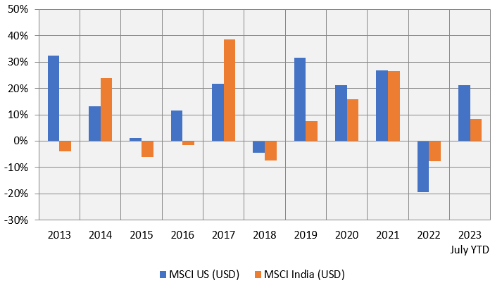 Source: MSCI, as on 31stJuly 2023. All returns are in USD terms. Disclaimer: Past performance may or may not be sustained in the future.